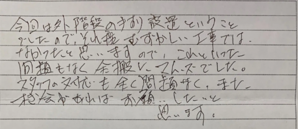 今回は外階段の手すり設置ということでしたので、それ程むずかしい工事ではなかったと思いますので、これといった問題もなく全般にスムーズでした。