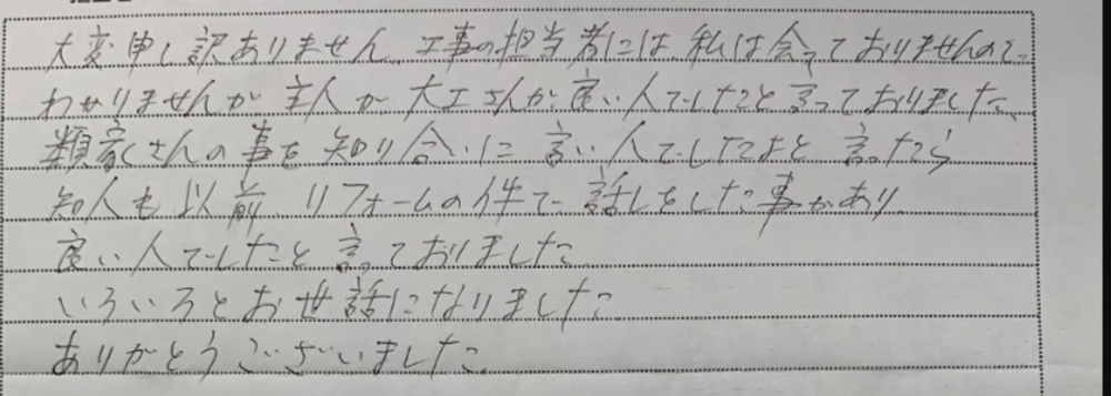 類家さんの事を知り合いに良い人でしたよと言ったら、知人も以前リフォームの件で話しをした事があり、良い人でしたと言っておりました。