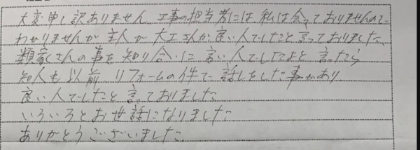 弊社スタッフ並びに職人についても高評価やお褒めの言葉をいただき、弊社スタッフ一同大変うれしく思っております。