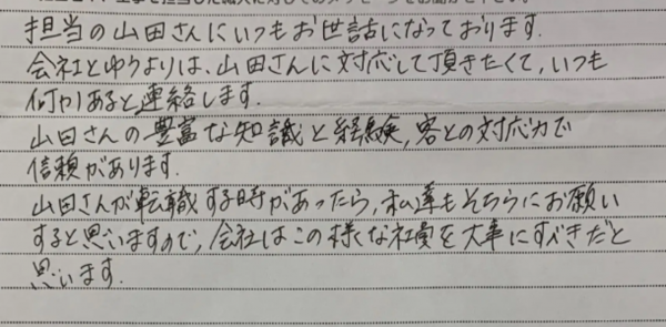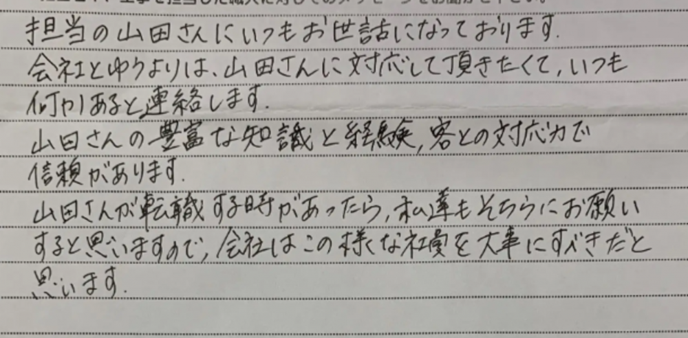 山田さんが転職する時があったら、私達もそちらにお願いすると思いますので、会社はこの様な社員を大事にすべきだと思います。