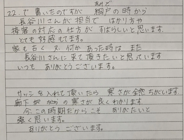 サッシの交換によって、お家の寒さが和らいだとのお言葉をいただき、大変うれしく、励みになります。