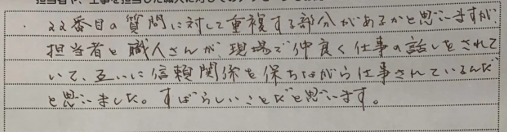 重複する部分があるかと思いますが、 担当者と職人さんが現場で仲良く仕事の話しをされていて、互いに信頼関係を保ちながら仕事をされているんだなと思いました。すばらしいことだと思います。