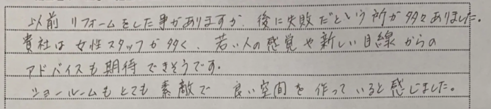 以前のリフォームでご不満な点があったとのこと、お察しいたします。そのような経験をされたからこそ、当社にご期待をお寄せいただいていること、大変喜ばしく思っております。