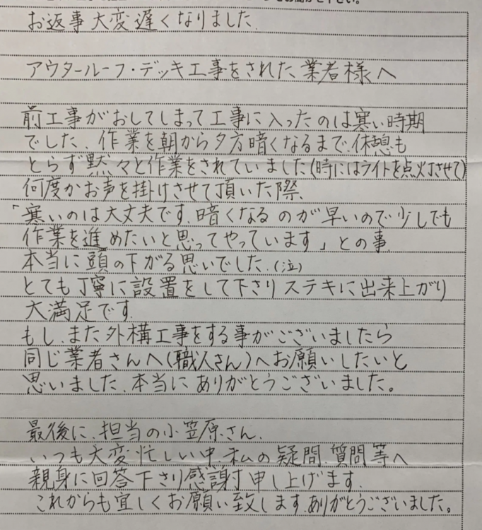 お返事大変遅くなりました。アウタールーフ・デッキ工事をされた業者様へ