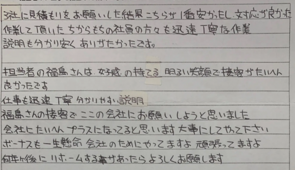 担当者の福島さんは好感の持てる明るい笑顔で接客がたいへん良かったです。福島さんの接客でここの会社にお願いしようと思いました。