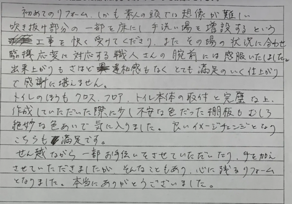 初めてのリフォーム、しかも素人の頭では想像が難しい吹き抜け部分の一部を床にし、手洗い場を増設するという工事を快く受けてくださり、またその場の状況に合わせ臨機応変に対応する職人さんの腕前には感服いたしました。 出来上がりもさほど異違和感なく、とても満足のいく仕上がりで感謝に堪えません。 トイレのほうもクロス・フロア・トイレ本体の取付と完璧な上、 作成していただいた際に少し不安な色だった棚板も、むしろ絶妙な色あいで気に入りました。良いイメージチェンジとなりこちらも満足です。せん越ながら一部お手伝いをさせていただいたり、手を加えさせていただきましたが、そんなこともあり、心に残るリフォームとなりました。本当にありがとうございました。
