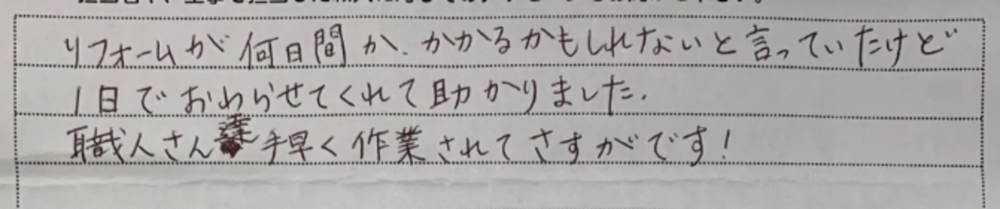 リフォームが何日間か、かかるかもしれないと言っていたけど 1日でおわらせてくれて助かりました。 職人さん早く作業されてさすがです!