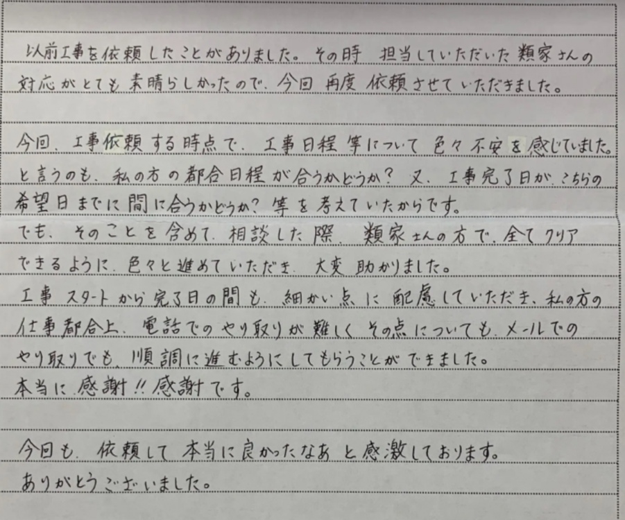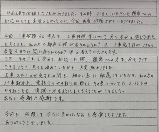 工事スタートから完了日の間も、細かい点に配慮していただき、私の方の仕事都合上、電話でのやり取りが難しく
