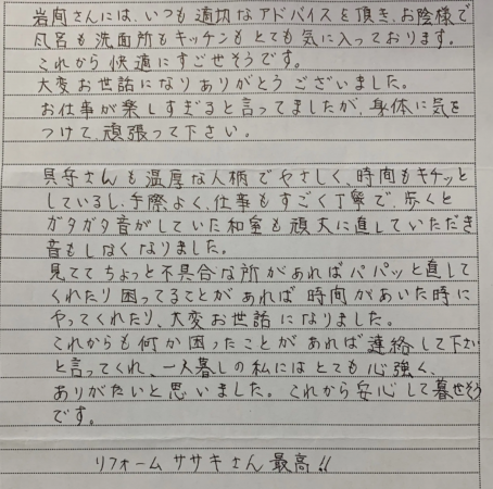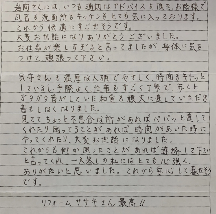 これから安心して暮せそう です。 リフォームササキさん最高!!