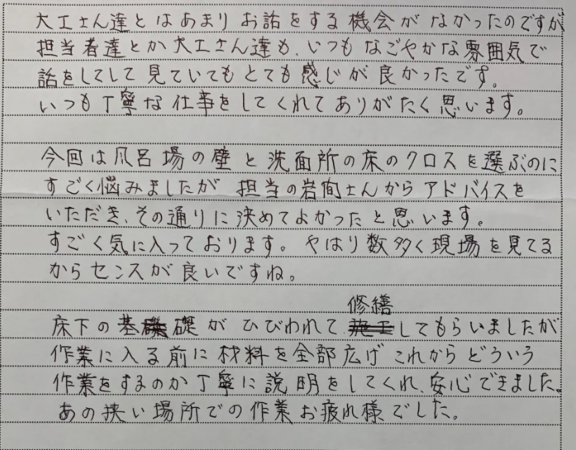 そして、狭い場所での作業への温かいお言葉も、職人たちの大きな励みとなります。