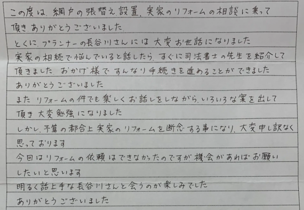 網戸の張替えとご実家のリフォームのご相談で当社をご利用いただき、心より感謝申し上げます。