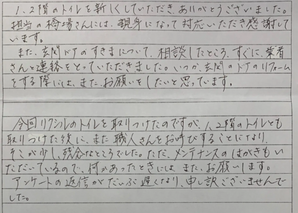 1、2階のトイレを新しくしていただきありがとうございました。