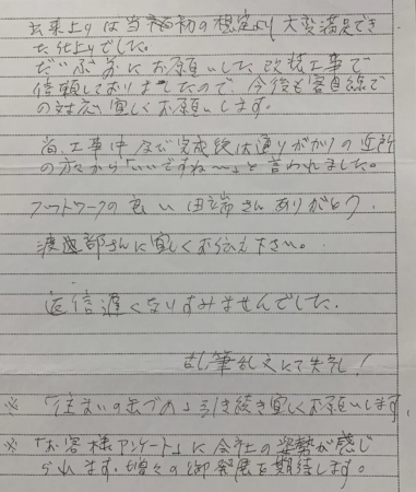 だいぶ前にお願いした、改装工事で信頼しておりましたので、今後も客目線での対応、宜しくお願いします。