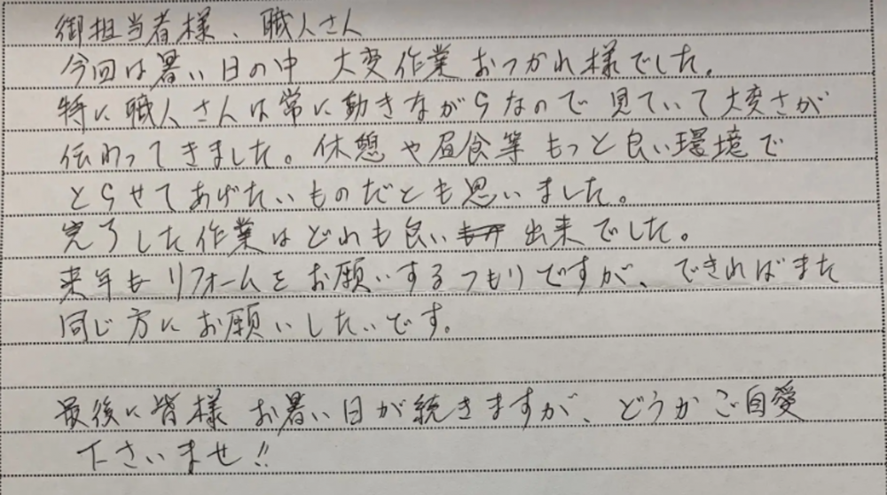 お客様から、暑い中の職人たちの作業に対し、温かいお心遣いの言葉をいただき、心より感謝申し上げます。