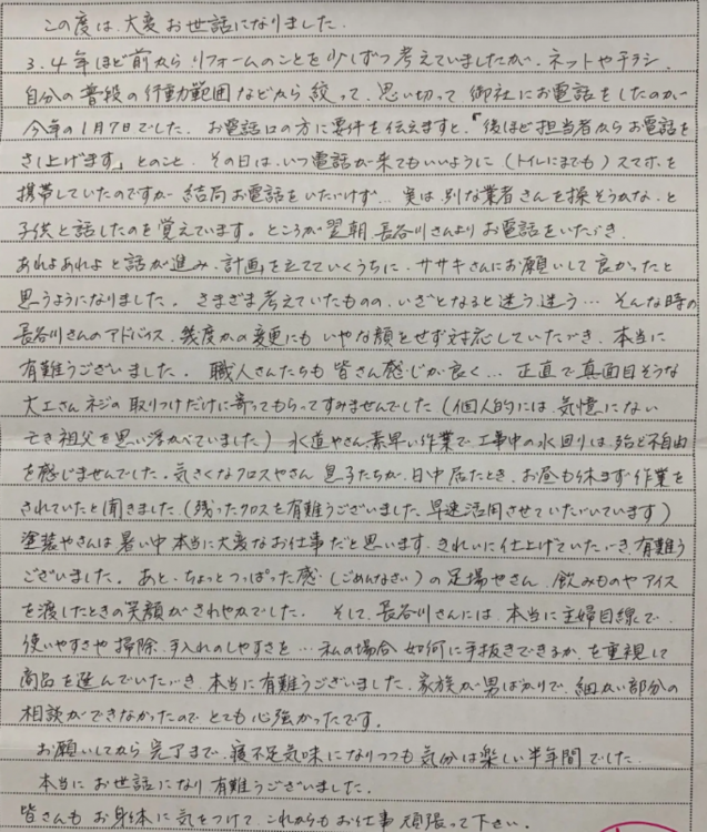 特に、担当の長谷川の適切なアドバイスや、職人たちの真面目な対応にご満足いただけたことは、私たちにとって大きな喜びです。